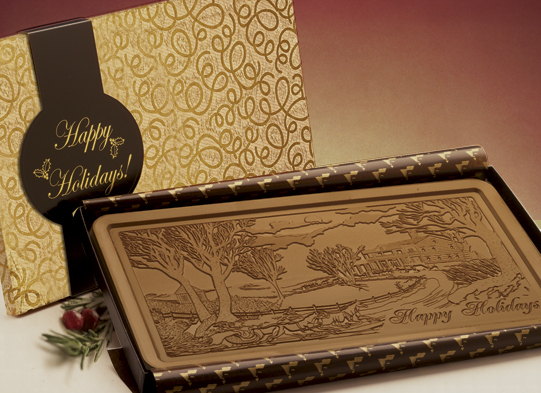 Two pounds of rich Belgian milk chocolate packaged in an elegant gift box with Happy Holidays imprinted gift band.